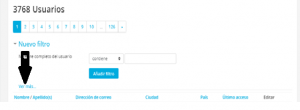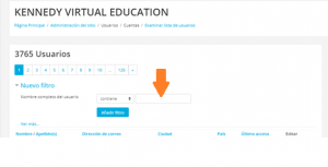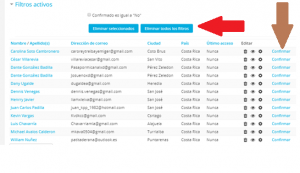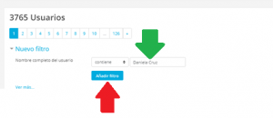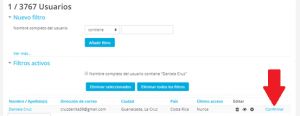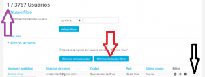 Para finalizar debes dar click en el botón que dice Eliminar todos los filtros ( flecha roja) para que el sistema vuelva a mostrar a todos los usuarios y no solo a uno( flecha morada)