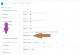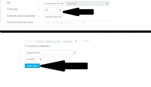 Ahora veremos una serie de opciones de filtrado de datos. Uno de ellos dice CONFIRMADO ( flecha morada), junto a la opción veremos una lista desplegable con las opciones SI y NO… Eso quiere decir que nos filtrará a los usuarios que SÍ estén confirmados o SOLAMENTE los que NO ESTÉN CONFIRMADOS.. Por lo que seleccionamos la opción NO… Y luego Añadir Filtro..